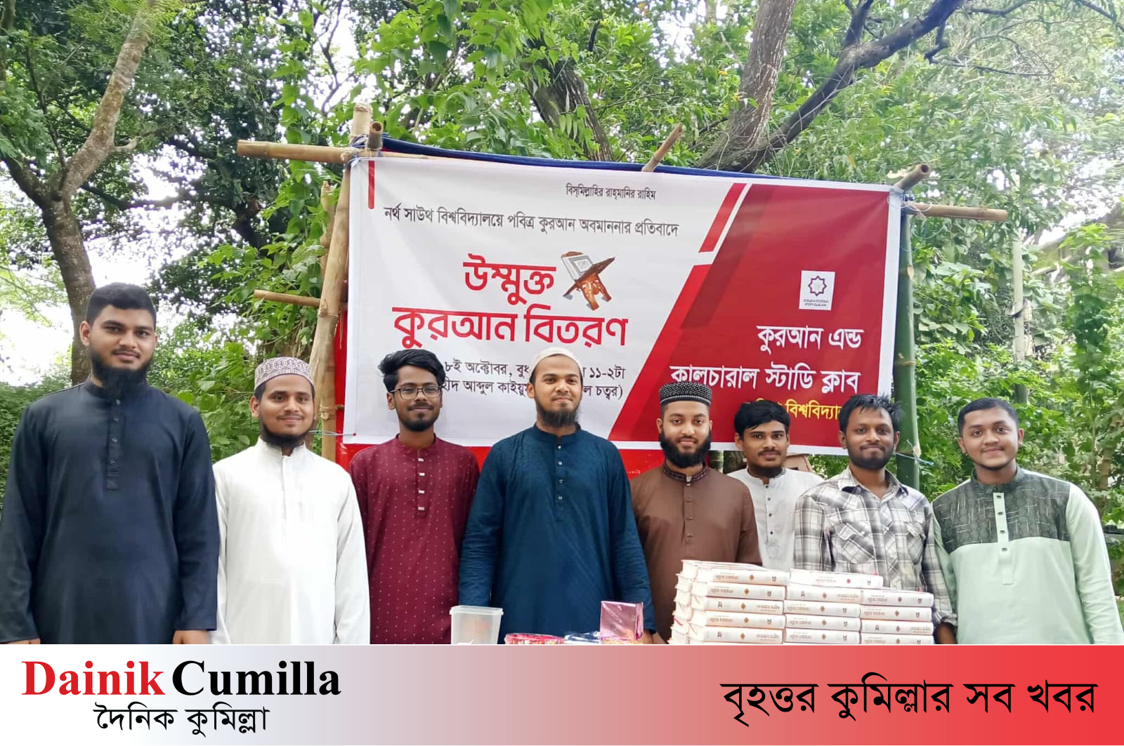 কুমিল্লা বিশ্ববিদ্যালয়ে (কুবি) নর্থ সাউথ বিশ্ববিদ্যালয়ে পবিত্র কুরআন অবমাননার প্রতিবাদে উন্মুক্ত কুরআন বিতরণ কর্মসূচি পালন করেছে কুমিল্লা বিশ্ববিদ্যালয়ের কুরআন অ্যান্ড কালচারাল স্টাডি ক্লাব।