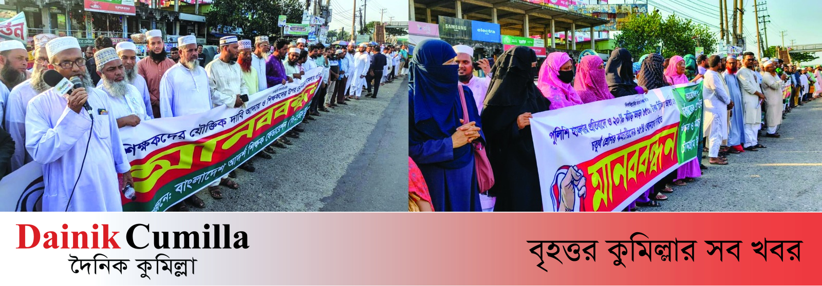বেসরকারি শিক্ষা প্রতিষ্ঠানের এমপিওভুক্ত শিক্ষক-কর্মচারীদের যৌক্তিক দাবি আদায় ও জাতীয় প্রেসক্লাবের সামনে শান্তিপূর্ণ কর্মসূচি পালনকালে শিক্ষকদের উপর পুলিশি হামলার প্রতিবাদে কুমিল্লার চৌদ্দগ্রামে শিক্ষকদের মানববন্ধন অনুষ্ঠিত হয়েছে।