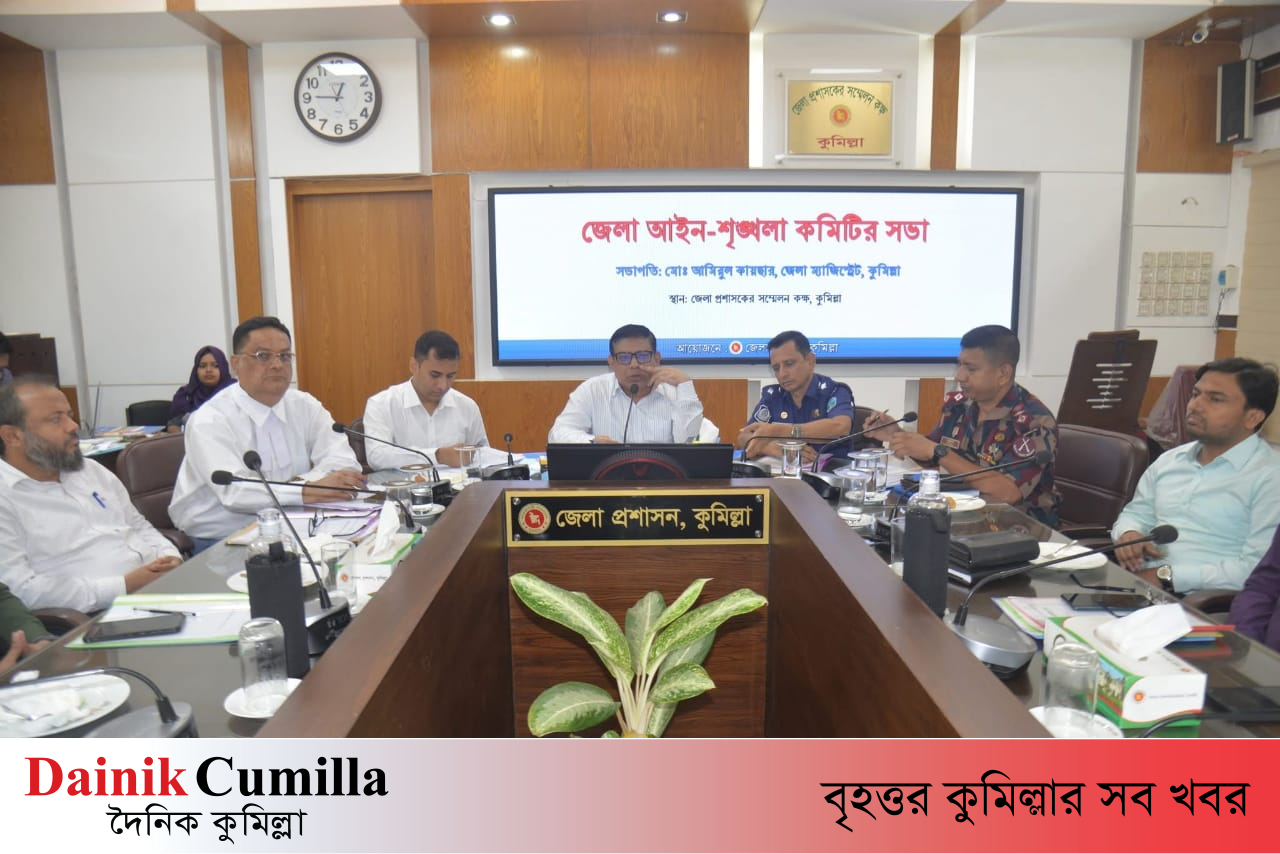 কুমিল্লায় জেলা আইন-শৃঙ্খলা বিষয়ক কমিটির সভা অনুষ্ঠিত হয়েছে।আজ মঙ্গলবার সকাল ১১ টায় জেলা প্রশাসকের সম্মেলন কক্ষে সভাটি অনুষ্ঠিত হয়েছে। জেলা প্রশাসক আমিরুল কায়সারের সভাপতিত্বে সভার শুরুতে কার্যপত্র পাঠ করেন অতিরিক্ত জেলা ম্যাজিস্ট্র্যাট মো. জাফর সাদিক চৌধুরী।সভায় উপস্থিত ছিলেন পুলিশ সুপার নজির আহমেদ খান, কুমিল্লা জেলা ও দায়রা জজ আদালতের পিপি অ্যাডভোকেট অ্যাডভোকেট কাইউমুল হক রিংকু, অতিরিক্ত পিপি অ্যাডভোকেট মোতালেব হোসাইন, জামায়াতে ইসলামীর মহানগরী নায়েবে আমীর অধ্যাপক এমদাদুল হক মামুন, এনসিপির কুমিল্লা মহানগরের যুগ্ম সমন্বয়কারী ইঞ্জিনিয়ার রাশেদুল হাসান, যুবশক্তির কেন্দ্রীয় কমিটির সদস্য মাজহারুল ইসলাম হানিফ, পরিবহন মালিক সমিতির সভাপতি জামিল খন্দকার, জেলার সকল উপজেলা নির্বাহী অফিসারগন সহ বিভিন্ন সরকারী দপ্তরের প্রধানরা।সভায় জেলার সামগ্রিক আইন-শৃঙ্খলা নিয়ে আলোচনা করা হয়। কুমিল্লা জেলার আইনশৃঙ্খলা পরিস্থিতি যেন ঠিক থাকে সে দিকে সভায় উপস্থিত সকলকে নজর রাখার জন্য জোর তাগিদ দেয়া হয়। যেন জেলার আইন-শৃঙ্খলা পরিস্থিতি স্বাভাবিক থাকে এবং কোন কারণে তার অবনতি হয়ে জনসাধারণের জান-মালের ক্ষতি সাধন না হয়। এই বিষয়ে সভার সকলকে সজাগ থাকার বিশেষ তাগাদা দেয়া হয়েছে।সভার কার্যপত্রে জানানো হয়, কুমিল্লায় সেপ্টেম্বর মাসে চাঁদাবাজি, চুরি, নারী ও শিশু নির্যাতন, মাদক ও অপমৃত্যু মতো অপরাধের সংখ্যা হ্রাস পেয়েছে। অপরদিকে ডাকাতির পরিমান বেড়েছে। স্থিতি রয়েছে ছিনতাই, খুন ও চোরাচালান।অপরদিকে কিছু অপরাধ প্রবণতায় সামান্য হলেও কমতির ধারা লক্ষ্য করা গেছে। জেলার সার্বিক আইন-শৃঙ্খলা পরিস্থিতি আইন-শৃঙ্খলা কমিটির মাসিক সভায় এসব তথ্য তুলে ধরা হয়। সভায় বিভিন্ন পর্যায়ের কর্মকর্তা, রাজনৈতিক নেতৃবৃন্দ ও নাগরিক সমাজের প্রতিনিধিরা উপস্থিত ছিলেন।