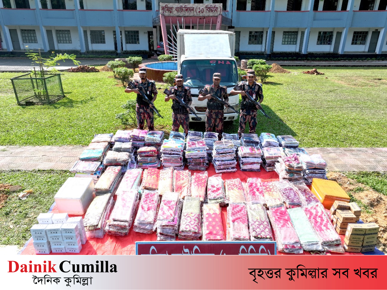 কুমিল্লার সীমান্ত থেকে এক কোটি ৭৪ লাখ টাকা মূল্যের ভারতীয় শাড়ি, মোবাইলের ডিসপ্লেসহ বিপুল পরিমাণ চোরাচালান পণ্য জব্দ করেছে বর্ডার গার্ড বাংলাদেশ (বিজিবি)।