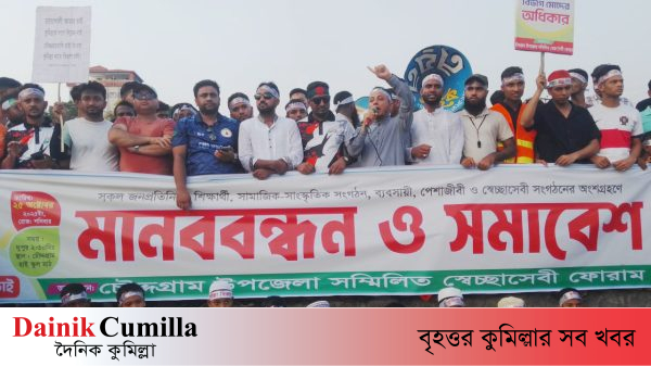 মুহা. ফখরুদ্দীন ইমন, চৌদ্দগ্রাম প্রতিনিধি: ‘কুমিল্লা নামে বিভাগ’ বাস্তবায়নের দাবিতে কুমিল্লার চৌদ্দগ্রামে সম্মিলিত স্বেচ্ছাসেবী ফোরাম এর উদ্যোগে বিশাল মানববন্ধন, র্যালি ও সমাবেশ অনুষ্ঠিত হয়েছে।