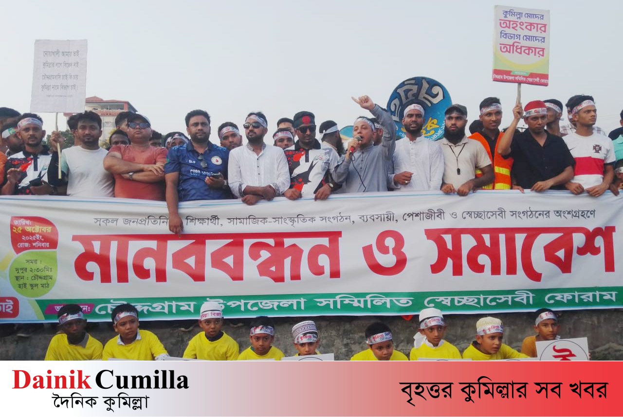 মুহা. ফখরুদ্দীন ইমন, চৌদ্দগ্রাম প্রতিনিধি: ‘কুমিল্লা নামে বিভাগ’ বাস্তবায়নের দাবিতে কুমিল্লার চৌদ্দগ্রামে সম্মিলিত স্বেচ্ছাসেবী ফোরাম এর উদ্যোগে বিশাল মানববন্ধন, র্যালি ও সমাবেশ অনুষ্ঠিত হয়েছে।