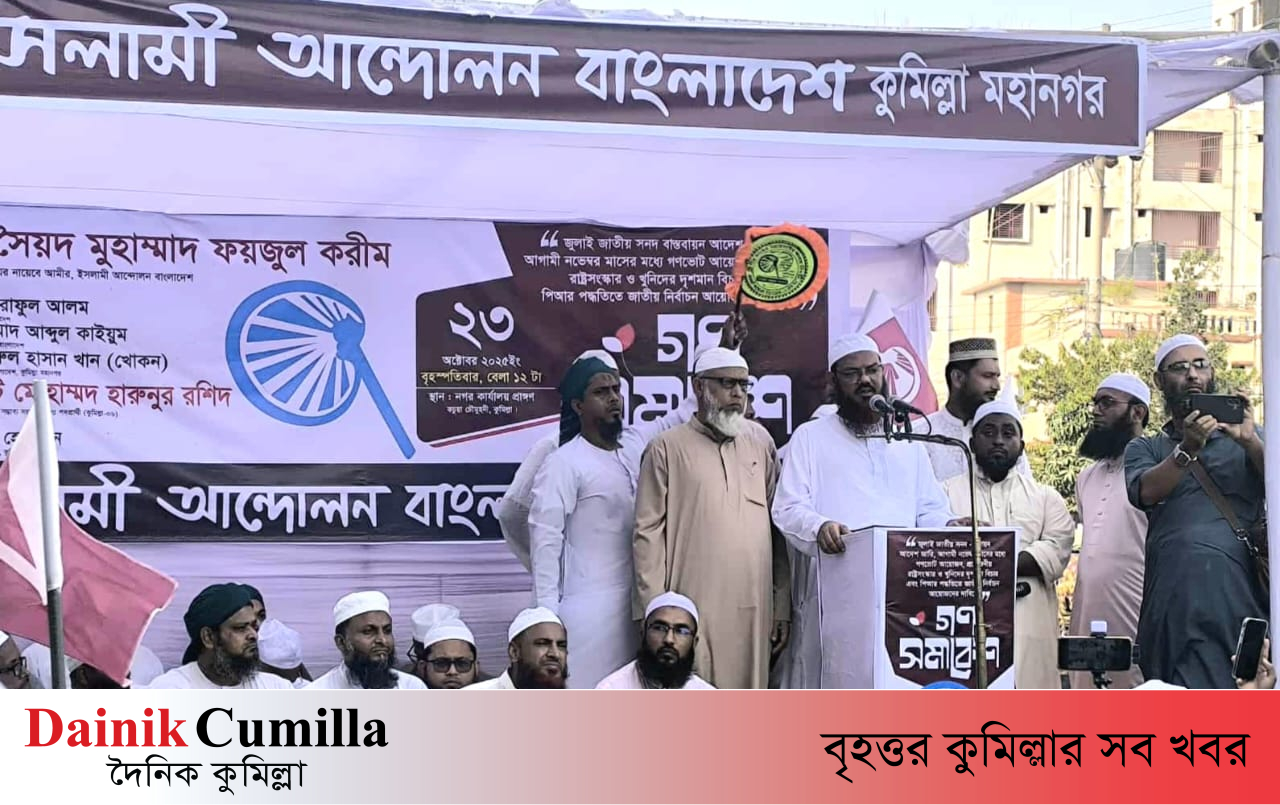 ইসলামী আন্দোলন বাংলাদেশ কুমিল্লা মহানগরের উদ্যোগে ুপিআর পদ্ধতিতে জাতীয় নির্বান, প্রয়োজনীয় রাষ্ট্রসংস্কার ও খুনিদের দৃশ্যমান বিচারের দাবির সমাবেশে বিশেষ অতিথি হিসেবে উপস্থিত ছিলেন ইসলামী আন্দোলন বাংলাদেশের যুগ্ম মহাসচিব প্রকৌশলী আশরাফুল আলম, সহকারী মহাসচিব মাওলানা আহমাদ আব্দুল কাইয়ুম, ইসলামী আন্দোলন বাংলাদেশ কুমিল্লা মহানগরের প্রধান উপদেষ্টা আলহাজ্ব কামরুল হাসান খান (খোকন) এবং কুমিল্লা-০৬ আসনের ঘোষিত সম্ভাব্য সংসদ সদস্য পদপ্রার্থী এডভোকেট মোহাম্মদ হারুনুর রশিদ। অনুষ্ঠানের সভাপতিত্ব করেন ইসলামী আন্দোলন বাংলাদেশ কুমিল্লা মহানগরের সভাপতি এম এম বিলাল হোসাইন।