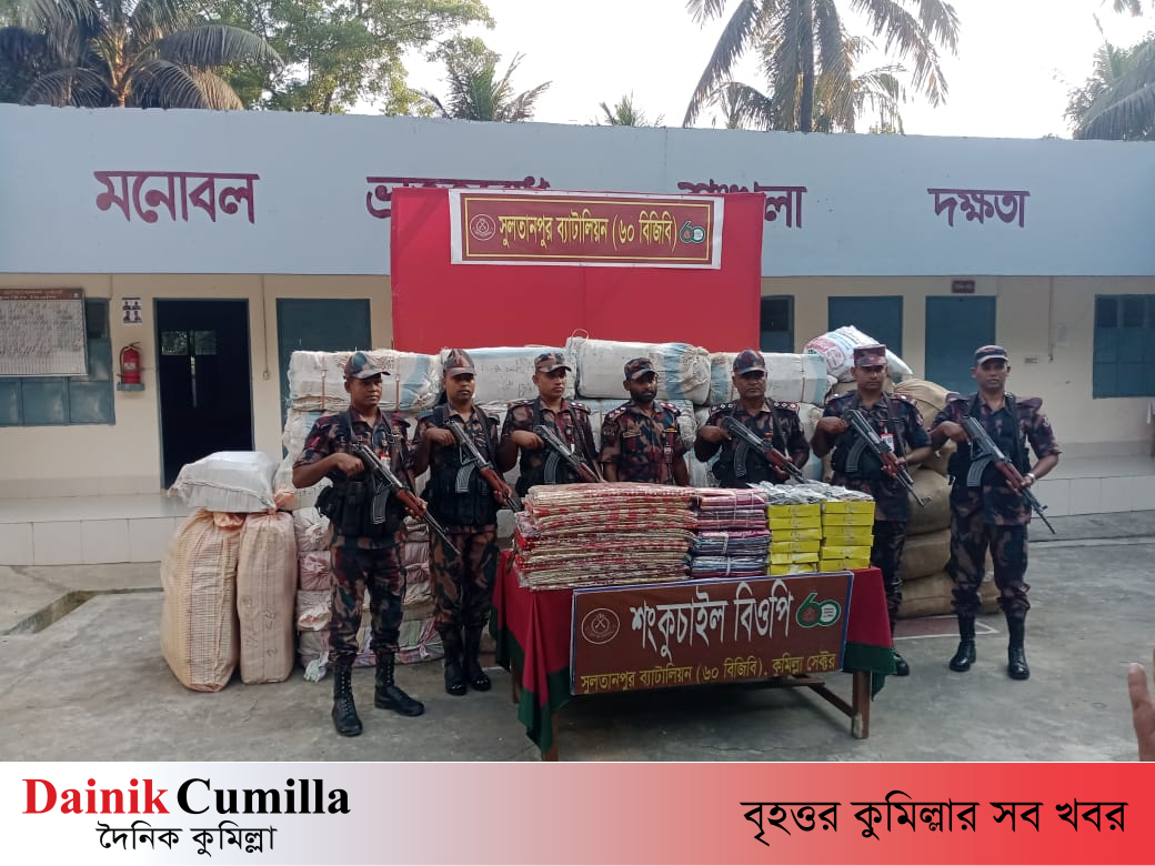 সুলতানপুর ব্যাটালিয়ন (৬০ বিজিবি) কর্তৃক দায়িত্বপূর্ণ কুমিল্লা জেলার বুড়িচং উপজেলার সীমান্তবর্তী এলাকায় বিশেষ অভিযান পরিচালনা করে ০৫ কোটি ৭০ লক্ষ ৭১ হাজার টাকা মূল্যের ভারতীয় অবৈধ পণ্য জব্দ করা হয়েছে । অবৈধ পণ্য গুলোর মধ্যে প্রায় ০১ কোটি ১৯ লক্ষ ৯১ হাজার টাকা মূল্যের অবৈধ ভারতীয় উন্নত মানের শাড়ী ও থ্রী পিস এবং ০৪ কোটি ৫০ লক্ষ ৮০ হাজার টাকা মূল্যের ভারতীয় চশমা রয়েছে।