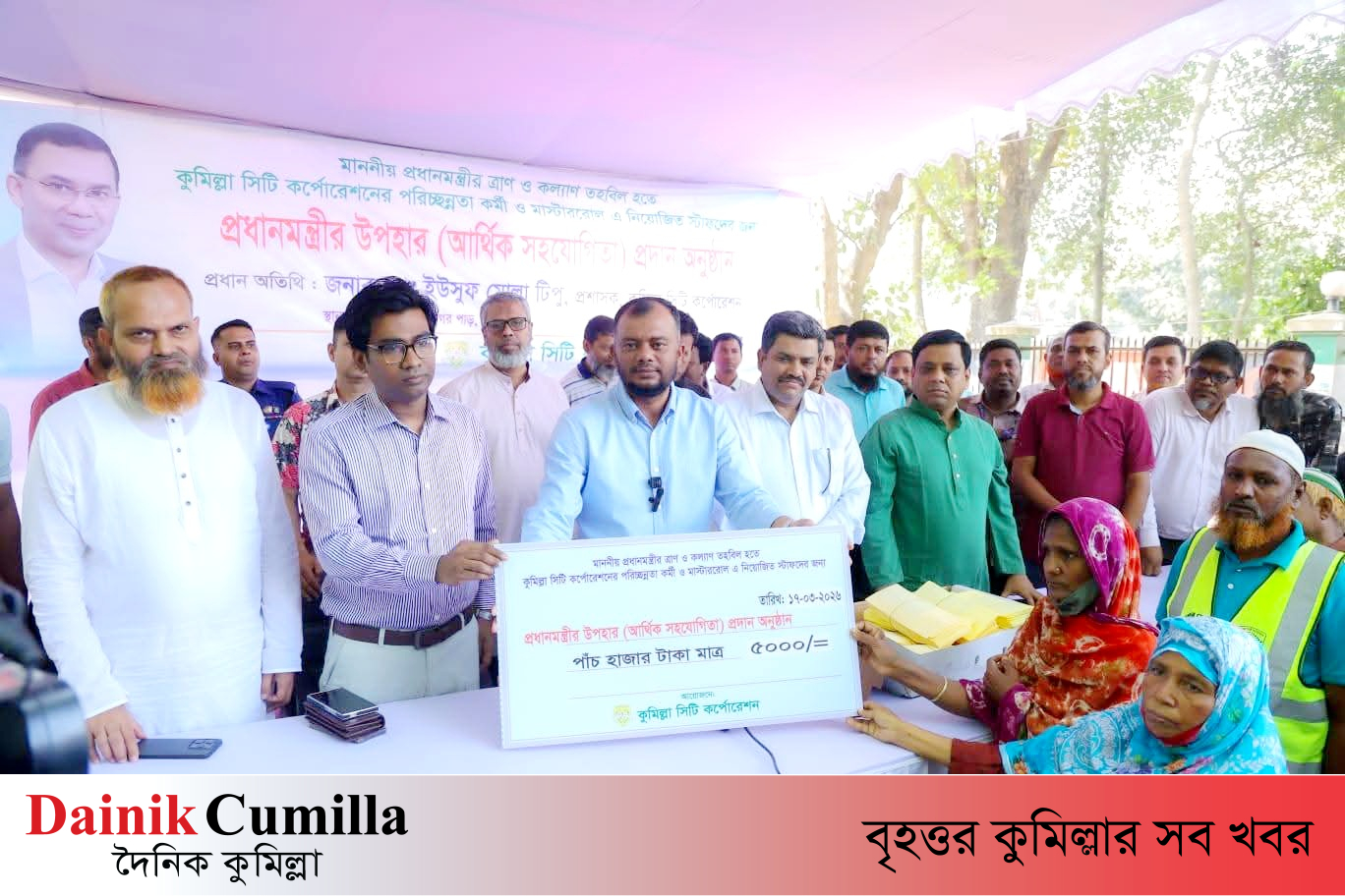 পবিত্র ঈদুল ফিতর উপলক্ষে কুমিল্লা সিটি কর্পোরেশনের (কুসিক) পরিচ্ছন্নতা কর্মী ও মাস্টাররোলভিত্তিক স্টাফদের মধ্যে প্রধানমন্ত্রীর ঈদ উপহার বিতরণ করা হয়েছে। প্রধানমন্ত্রী তারেক রহমানের ত্রাণ ও কল্যাণ তহবিল থেকে এসব আর্থিক সহায়তা বিতরণ করা হয়। এ উপলক্ষে ৪১ লাখ ৬০ হাজার টাকার অনুদান কর্মীদের মধ্যে আনুষ্ঠানিকভাবে প্রদান করা হয়।