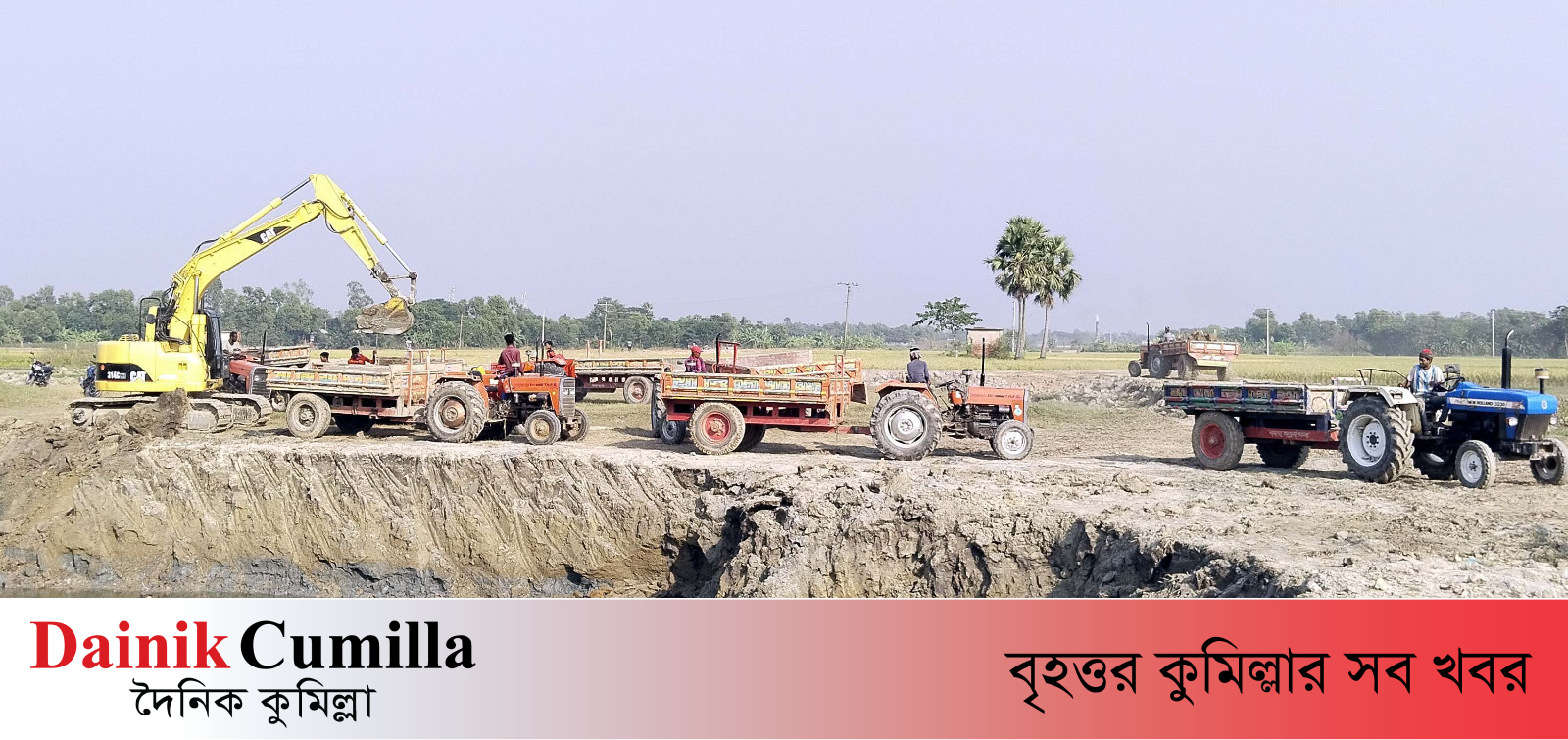 কুমিল্লার মুরাদনগর উপজেলার তিন ফসলি জমির বুক চিরে ছুটছে ট্রাক্টরের পর ট্রাক্টর। লক্ষ্য ফসলি জমি থেকে কাটা মাটি ইট ভাটায় নিয়ে আসা। সামান্য অদূরেই চলছে বিস্তীর্ণ ফসলি জমির মাঝ খান থেকে অত্যাধুনিক ভেকু মেশিন দিয়ে জমির মাটি কাটার কর্মযজ্ঞ। সে মাটি সংগ্রহে ব্যস্ত অসংখ্য ইটভাটার শ্রমিক। যেই জমির উপরিভাগে ধান বোনা হতো সে জমিতে এখন বিশাল আকারের র্গত। এভাবেই মুরাদনগর উপজেলার বিপুল পরিমাণ ফসলি জমির মাটি যাচ্ছে ইটভাটার পেটে। এতে করে ওই জমিগুলো যেমন উর্বরতা হারাচ্ছে তেমনি ধ্বংস হচ্ছে এসব ফসলি জমি।